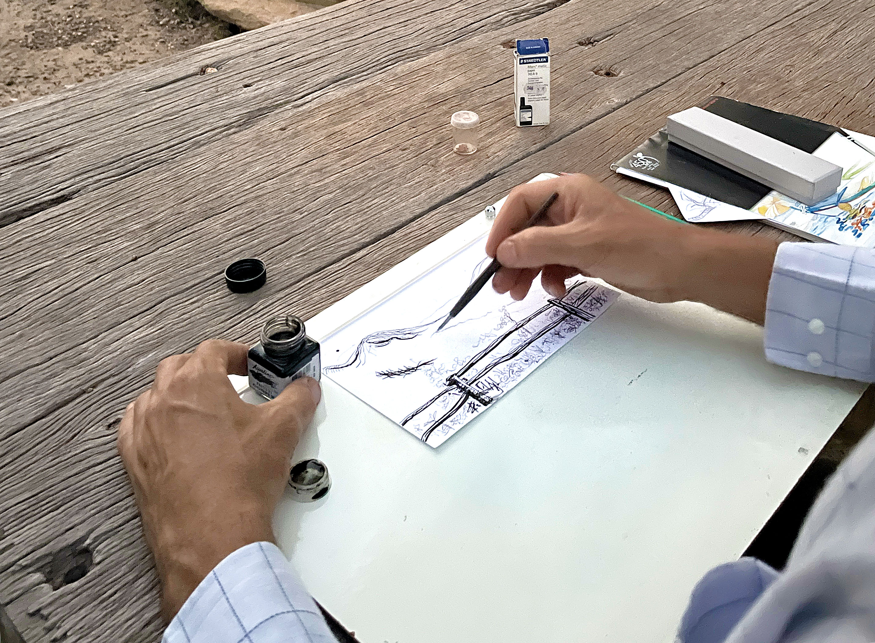 A partir da observação da PAISAGEM NATURAL, a oficina trabalha com a ideia de LINHA como elemento estrutural que delimita e dá forma à paisagem. A pena de bambu é um instrumento de aparência rústica, mas muito versátil, seu TRAÇO é mais suave que o da caneta bico-de-pena de metal, com mais variações na espessura da linha possibilitando um maior liberdade de intensidade dos traços. A paisagem montanhosa da Serra do Gandarela oferece uma variedade de TEXTURAS e ricas variações tonais nos PLANOS que se perdem no horizonte tornando-se um motivo ideal para ser capturado com a PENA DE BAMBU.